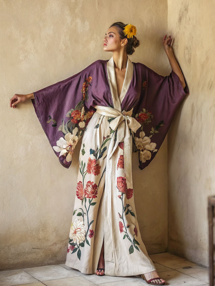 Artistic Floral Women's Kimono Linen Robe (With Belt)